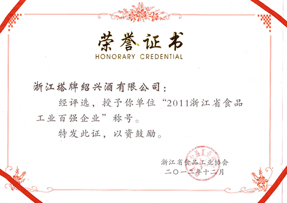 2011年度浙江省食品工業百強企業稱號榮譽證書